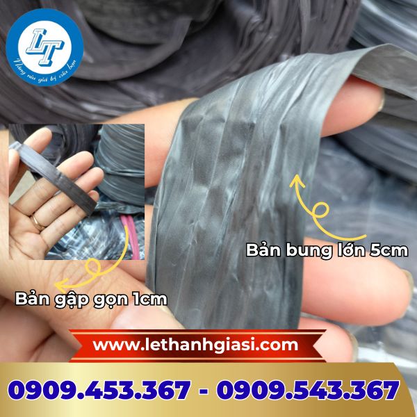 Hình dạng: Dây nilon bản dẹt chiều rộng 1 - 3cm lúc gập, 5 - 6cm khi không gập, dây quấn nhiều vòng hình trụ tròn và có lõi rỗng ở giữa.